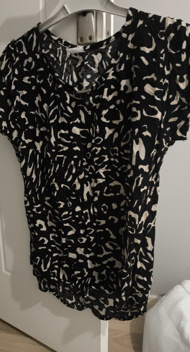Desenli siyah beyaz hamile bluzu, V yaka ve kısa kollu. Düğmeli ve bol kesim, günlük kullanım için uygun.