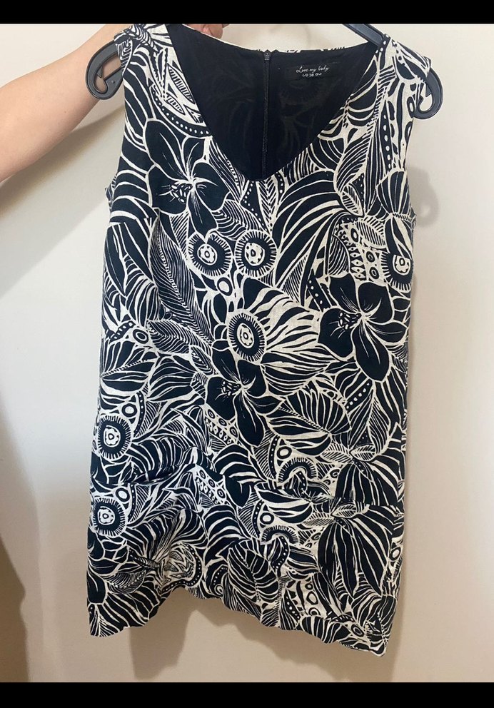 Desenli siyah, V yakalı, kolsuz elbise. Bol kesim, midi boy ve arkada fermuarlı. Günlük kullanım için bohem tarzda uygun.