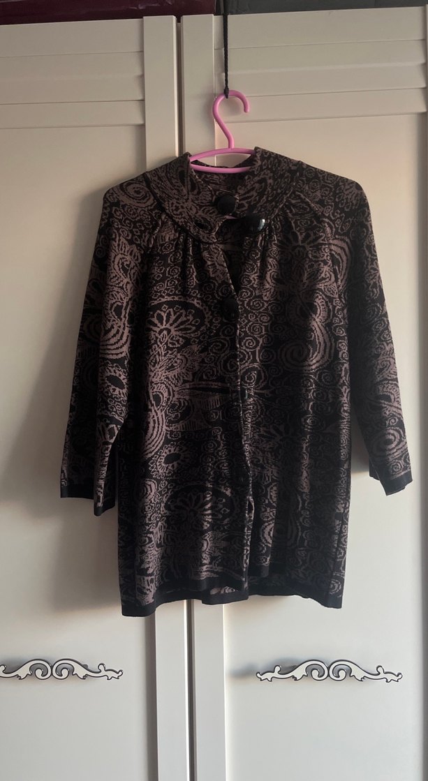 Desenli kahverengi siyah hırka, yüksek yakalı ve düğmeli. Uzun truvakar kollu (dirsek altından biraz uzun. Bileğe kadar uzun değil) ve bol kesim, ofis için rahat ve retro tarzda. Elegant bir duruşu var. 42-44 rahat olur Ekol on marka.