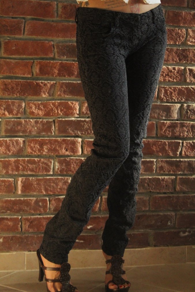 Siyah/antrasit renk üzerine gri tonlarında barok desenler bulunan dar pantolon. Düşük bel. Kalpli bir düğmesi bulunur. desenler dantele benzetilebilir. Normal boy, fitted skinny pantolon. Trendy casual ve goth street style tarzına uygun. 28 beden, S bedenle uyumlu