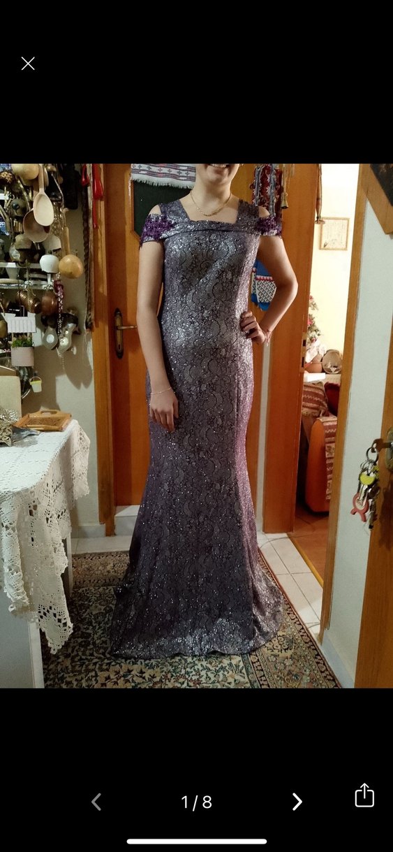 Desenli, straplez, vücuda oturan uzun abiye elbise. Gri-mor tonlarında drapeli kumaş, çağdaş ve gösterişli tarzda, düğünler için uygun. Kolsuz ve klasik şıklıkta.