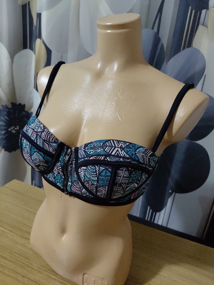 Desenli, strappy askılı ve kemerli detaylı, vücuda oturan bikini üstü. Günlük kullanıma uygun, cesur ve bohem tarzda.