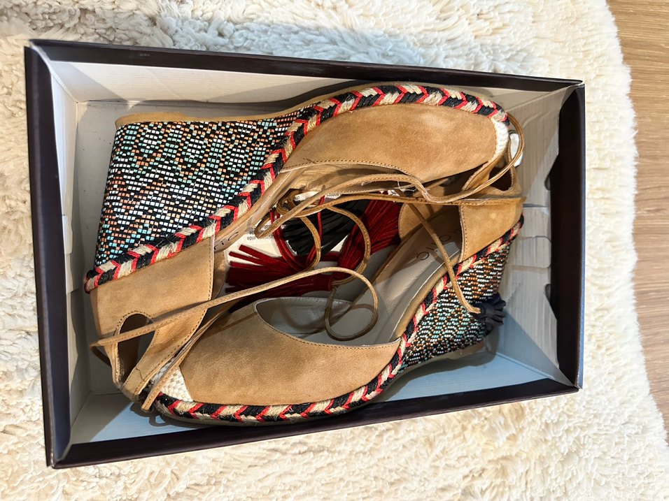 Süet üst yüzeyli, desenli ve kemerli dolgu topuklu ayakkabılar, bohem tarzı için uygundur. Koyu ve canlı renkleriyle günlük kullanıma rahat bir seçenektir.