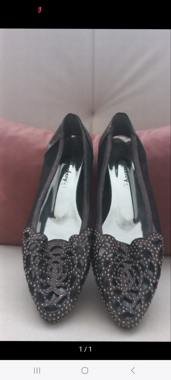 Gümüşi renkli, desenli ve tokalı kadın topuklu ayakkabılar. Kauçuk malzemeden yapılmış, gotik stil ile klasik şıklığı bir araya getirir, düğün için uygundur.