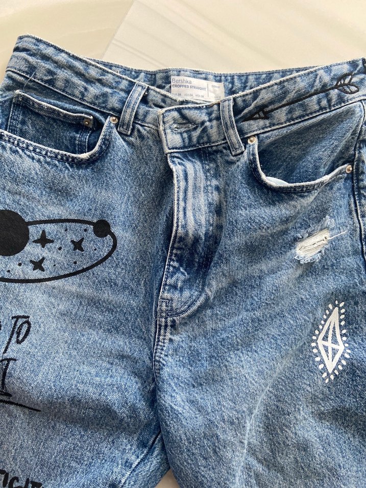 Desenli ve tokalı, bol kesim mavi denim pantolon. Midi boy, günlük kullanıma uygun rahat bir sokak stili ürünü.