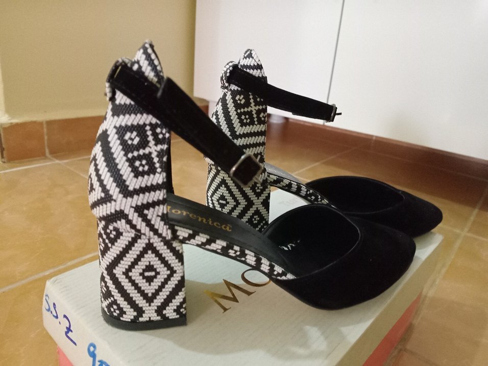 Sentetik kumaştan yapılmış, desenli ve tokalı siyah blok topuklu bohem tarzı akşam ayakkabısı. Ayak numarası 38 dir ama 39.5 giyen bana da oluyordu ama boyum uzun olduğu için rahat edememedim