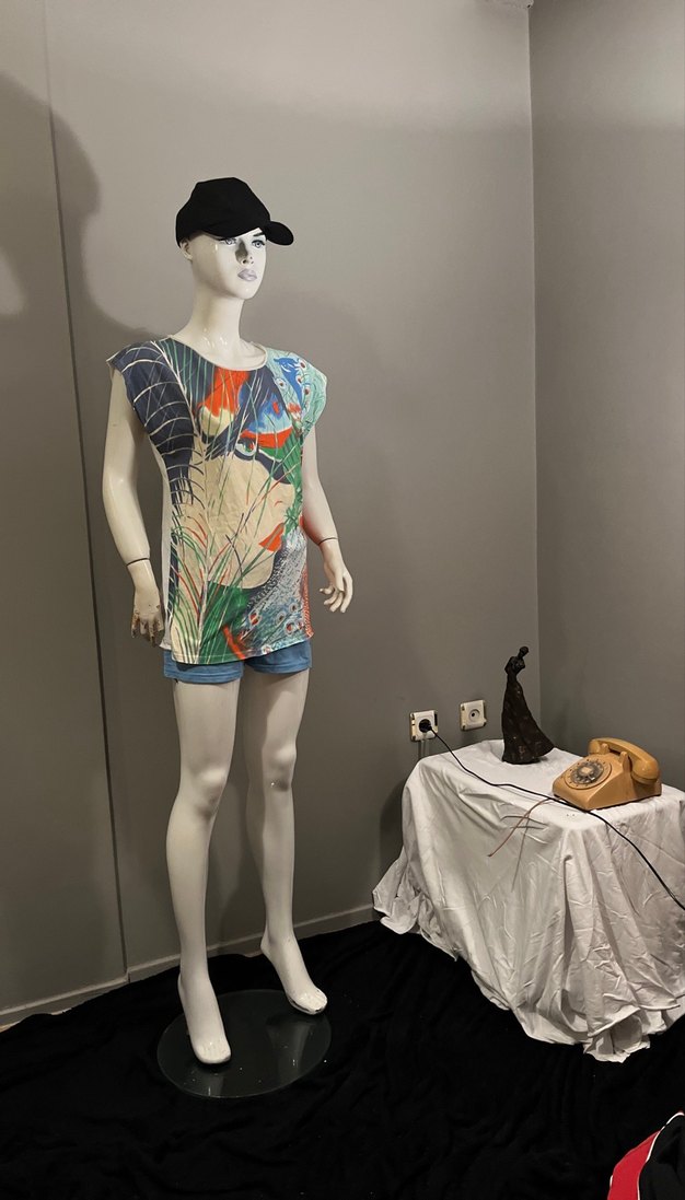 Bol kesim, kısa boylu hamile tunik, canlı çok renkli desenli ve transparan detaylıdır. Kısa kollu, askısız yakalı, günlük avant-garde tarz için uygundur.