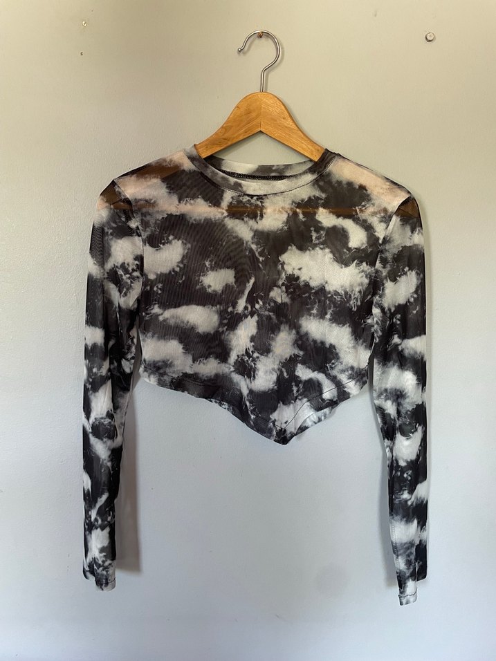 Sıradanlıktan sıkılanlar için mükemmel bir parça: Siyah ve beyazın bulutlar gibi iç içe geçtiği bu crop top, dinamik ve modern bir görünüm sunuyor. Şeffaf (file) kumaşıyla dikkat çekerken, ön kısmındaki asimetrik kesim detayıyla da tarzınıza iddialı bir dokunuş katıyor. İster festivalde ister gece dışarı çıkarken, ister yüksek bel bir pantolonla ister mini etekle kombinle. Bu üstle her anın starı sen olacaksın!