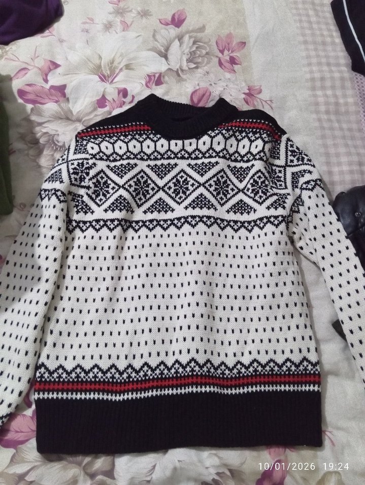 Desenli, uzun kollu, yuvarlak yakalı kadın triko kazak. Rahat kesimi ve normal boyu ile günlük kullanıma uygundur.