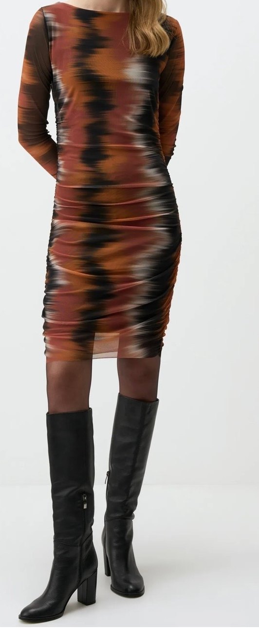 Dar kesimlidir.Kayık yaka,desenli bir tül bir elbisedir.M/L bedene uygundur.Hiç giyilmemiştir sadece etiketi mevcut değildir.