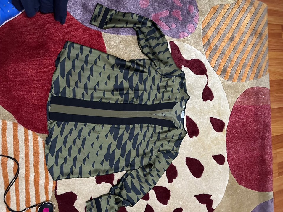 Uzun kollu tunik, koyu haki desenli, V yakalı ve fermuarlı ön kısmı ile günlük sokak stili için uygundur.