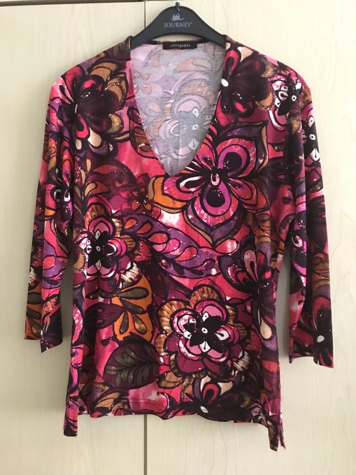 Desenli, koyu pembe renkte, uzun kollu ve V yakalı kadın bluzu. Bol, drapeli kesimi ve midi boyu ile bohem tarzı yansıtıyor. Amerika’dan hediye gelmişti bıyu uzun olduğu için hiç giyilmedi. Ölçüsü göğüs 48 cm boy 70 cm