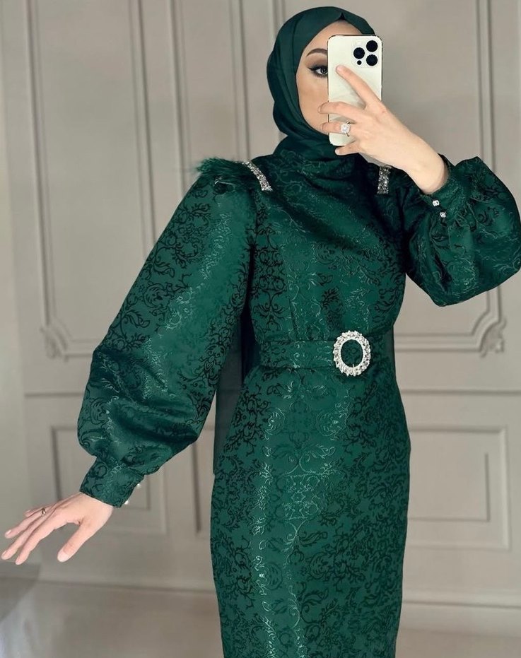 Parlak kumaştan, yüksek yakalı ve uzun kollu, beli kemerli, dar kesim uzun abiye elbise.