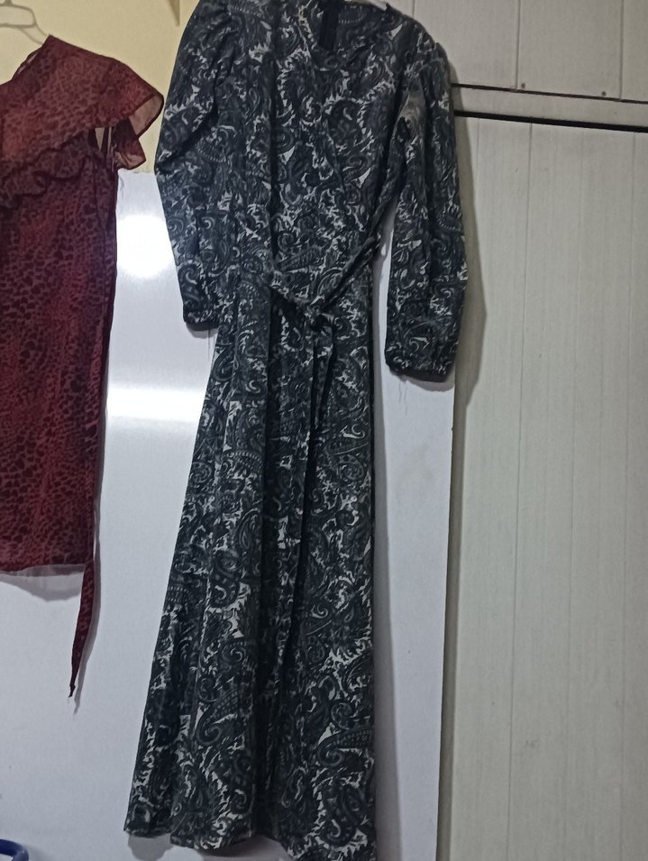 desenli, uzun ve bol kesim elbise, yüksek yakalı ve uzun kolludur. Drapeli tasarımıyla vintage bohem tarzı sunar, günlük kullanıma uygundur.