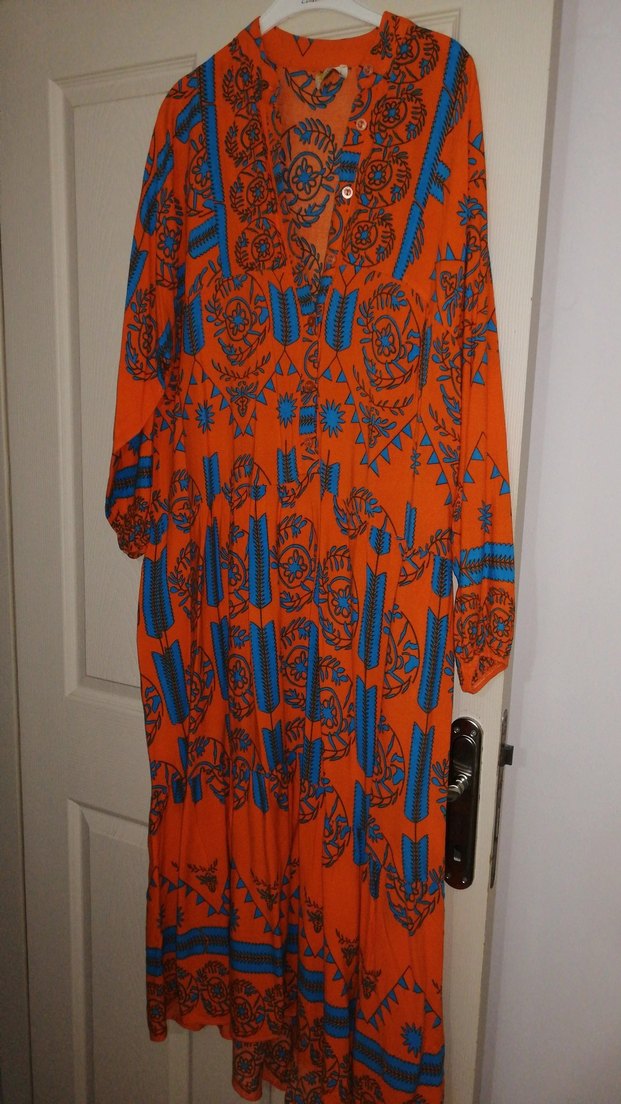 Uzun, bol kesim bohem elbise, uzun kollu ve V yaka detaylıdır. Sentetik kumaştan yapılmış, pileli ve canlı çok renkli desene sahiptir.