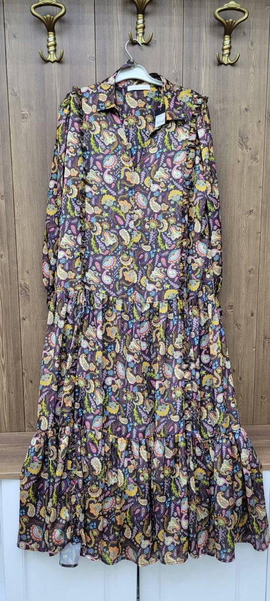 Sentetik kumaştan, uzun kollu ve salaş kesim bohem elbise. Koyu renkli çok desenli ve fırfır detaylıdır. etiketli kesim oldukca rahattir 40 bedene kadar uyumlu kemeli elbisedir