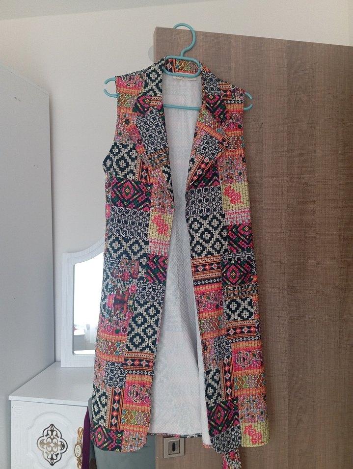 Canlı renklerde, desenli uzun yelek, kolsuz ve kemerli, normal kesim ve bohem tarzı için uygun.