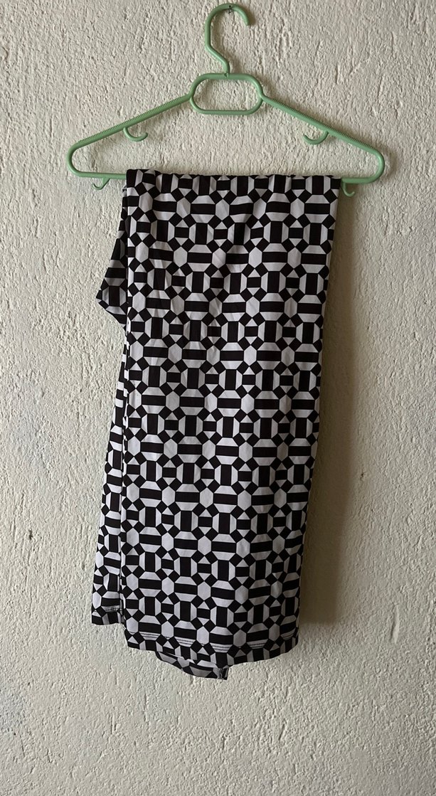 Siyah ve gri geometrik desenli, sentetik kumaştan uzun drapeli hamile eteği, rahat regular fit sunar.