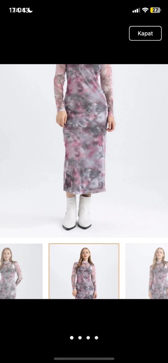 Uzun kollu, yüksek yakalı ve gri-pembe desenli, vücuda oturan uzun elbise. Günlük kullanıma uygun, içerisinde birşey giyilmelidir