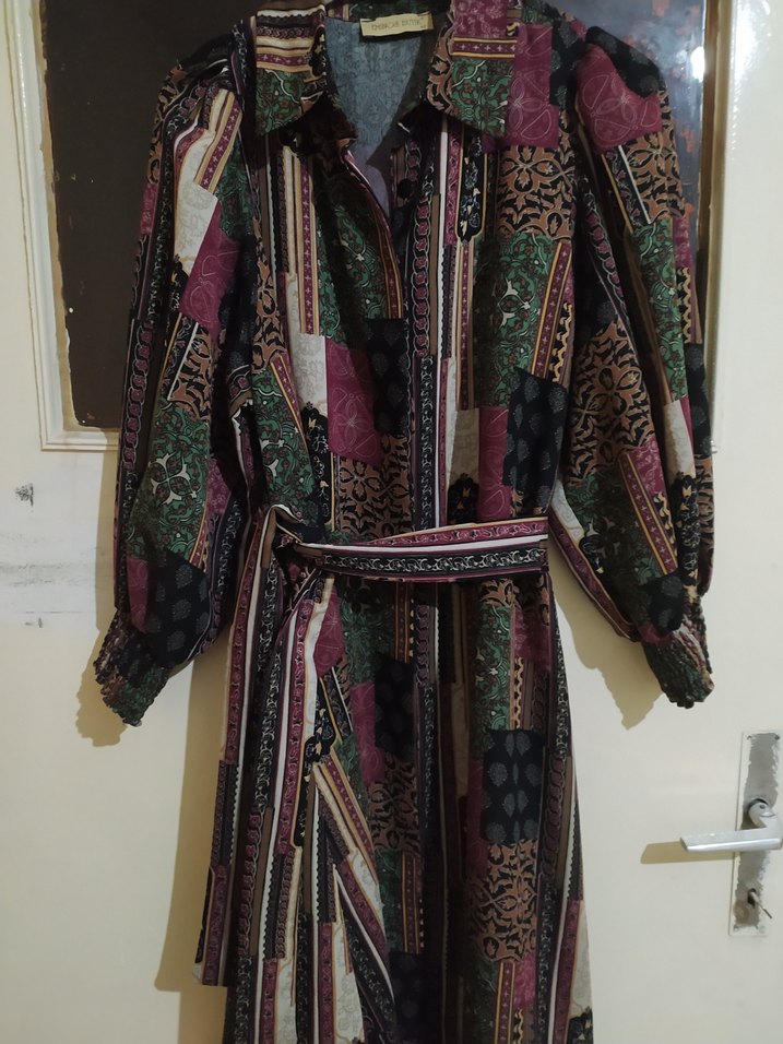 Bu uzun, bol kesim elbise koyu renkli, desenli kumaştan yapılmış, kemerli ve yakası kesik yakalıdır. Uzun, manşetli kollara sahiptir, bohem tarz için uygundur.