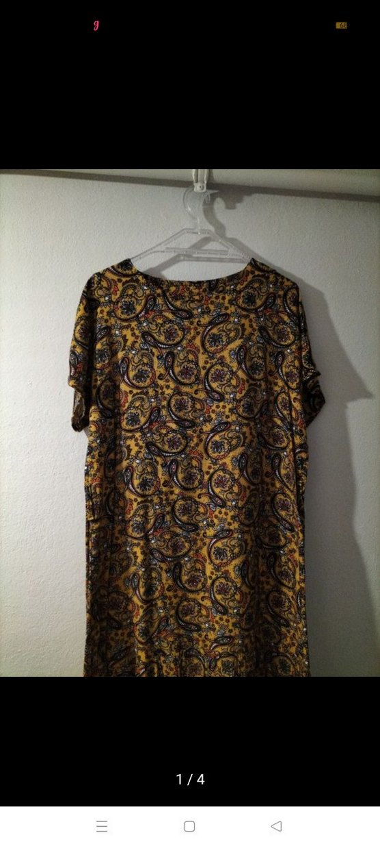 Kısa kollu, yuvarlak yakalı, bol kesim kadın tunik. Çok renkli ve desenli ipeksi kumaştan, bohem tarzda drapeli.