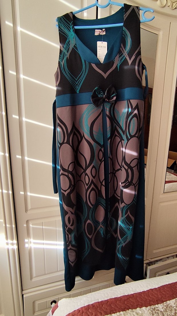kemerli, desenli uzun hamile abiyesi. Yumuşak sentetik kumaştan, koyu turkuaz renklerde, fit kesim ve goth tarzında.