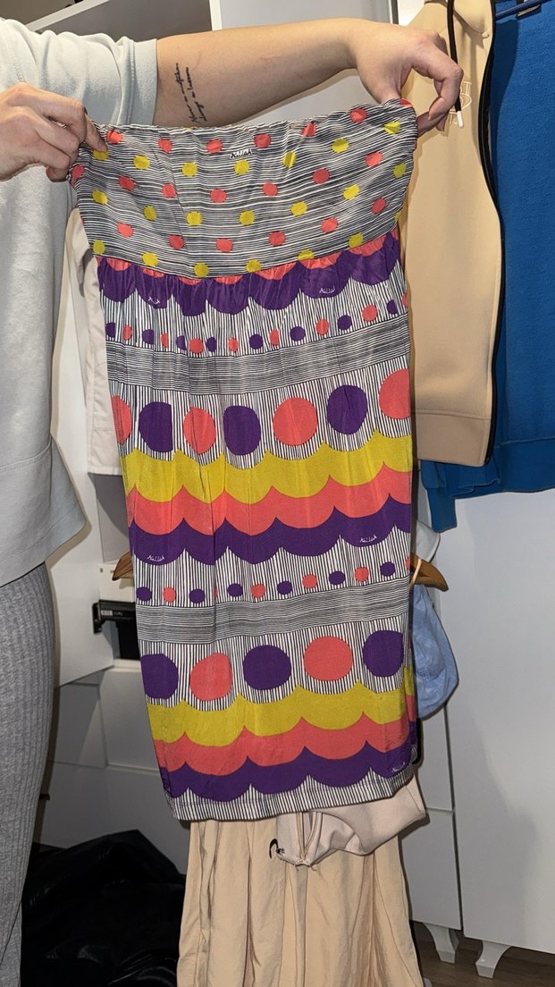 Bu uzun hamile eteği, bol kesim ve drapeli tasarıma sahip, gri, mor, turuncu ve sarı renklerin yer aldığı canlı desenli. Günlük kullanıma uygun bohem ve retro tarzda.