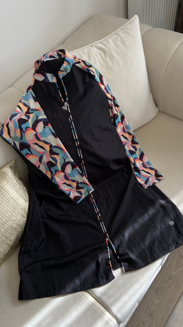 Yüksek yakalı ve uzun kollu, drapeli, sıkı kesim hamile ceketi. Kolları ve yanları çok renkli tie-dye desenli, önü siyah, sokak ve athleisure tarzına uygun.