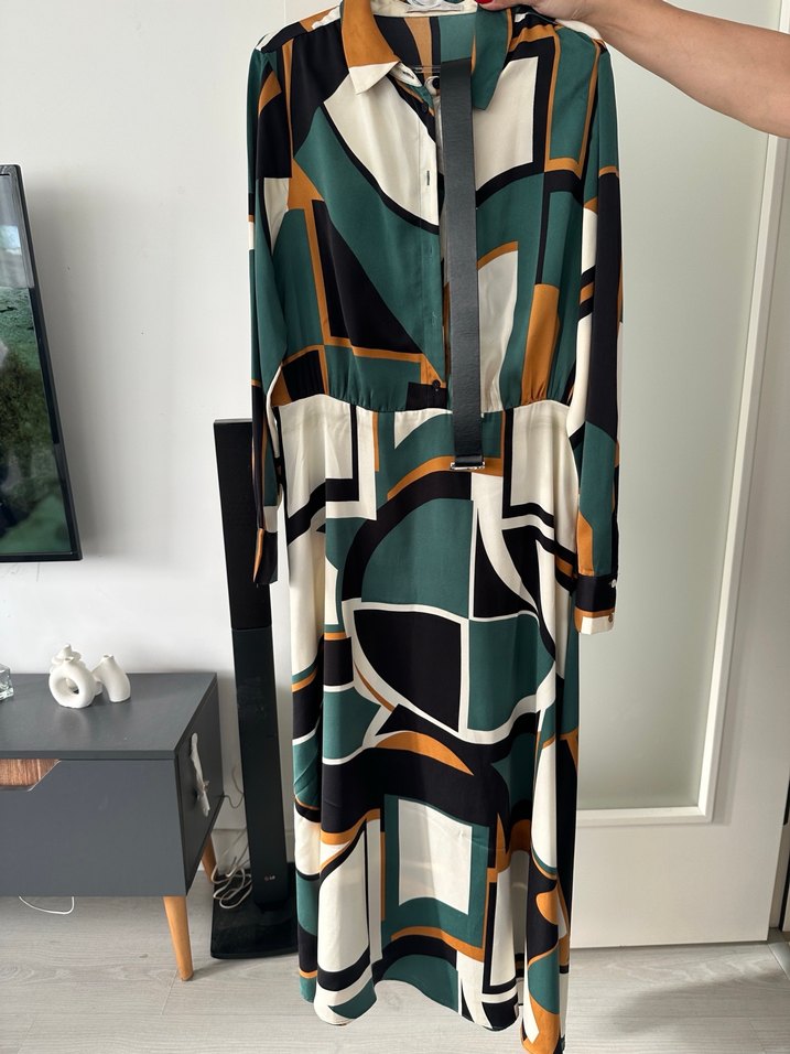 Kemerli ve V yakalı, çok renkli desenli uzun kadın elbisesi. Salaş kesimli ve uzun kollu, ofis için uygun.