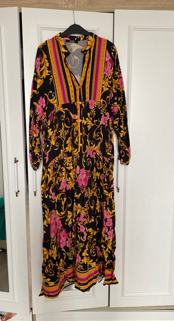 Bu uzun, bol kesim elbise koyu, çok renkli desenli kumaştan yapılmıştır. V yaka ve uzun kolludur, zincir detaylarıyla bohem tarzını yansıtır.