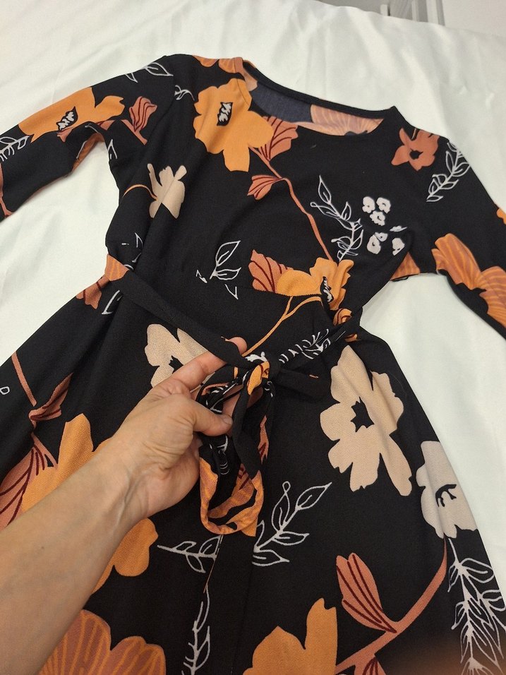 uzun kollu, bisiklet yaka, rahat kesim tesettur elbisesi. Koyu kahverengi çiçekli desenli, günlük kullanıma uygun.kusali