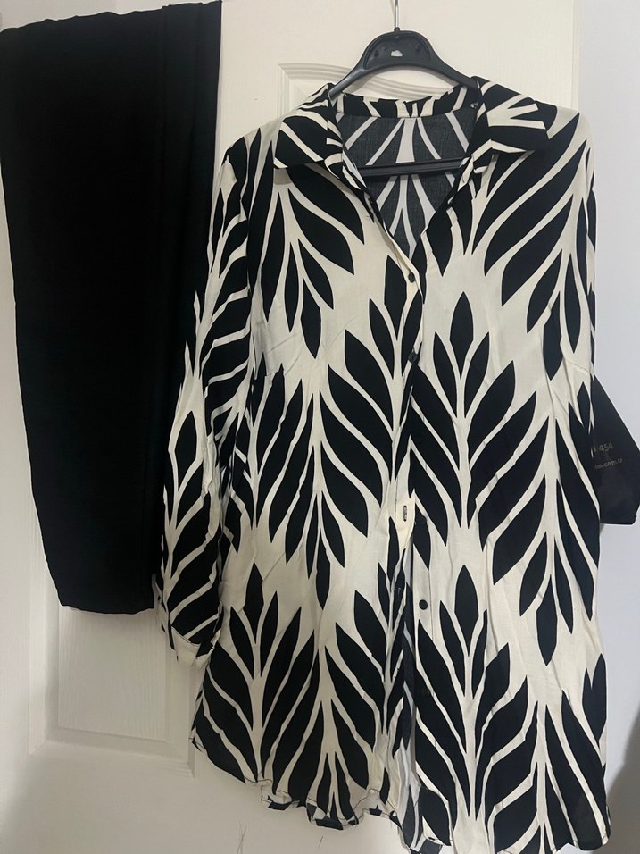 Bol kesim, uzun kollu, V yakalı takım gömlek Siyah beyaz yaprak desenli ve pileli detaylara sahip, yumuşak sentetik kumaştan üretilmiştir. Alt üst takımdır beden yazmıyor ama L bedene kadar uygundur