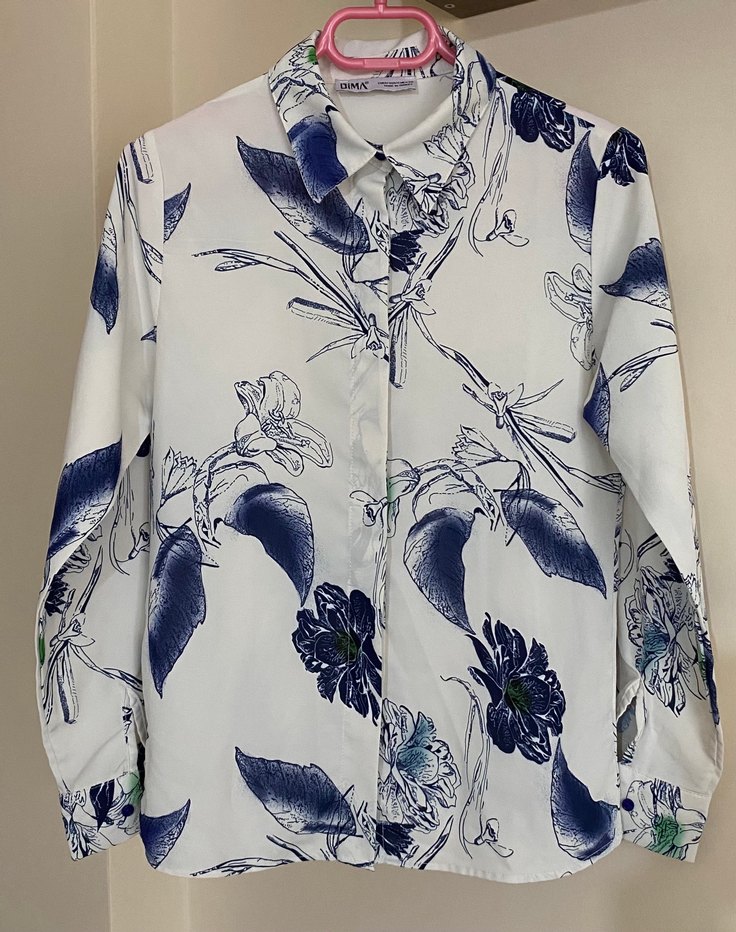 Beyaz zemin üzerine mavi çiçek desenli, uzun kollu gömlek. Klasik kesim.