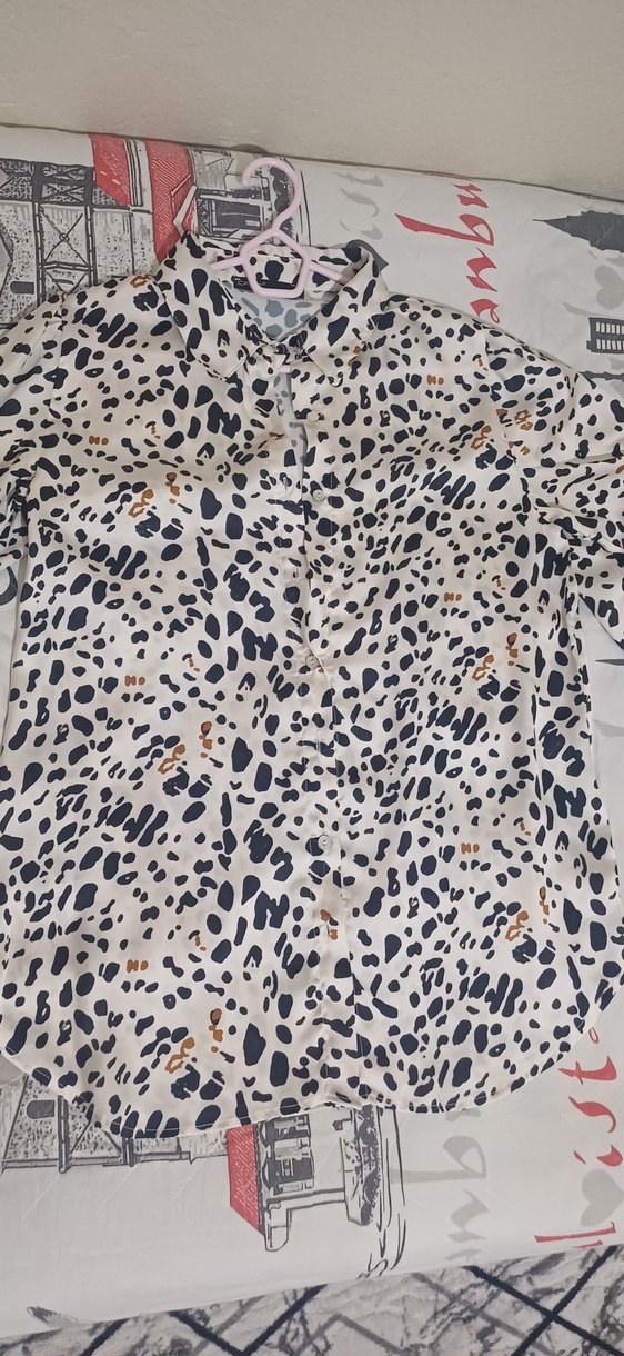 Yılan desenli, uzun kollu, bilek boy, düğmeli ve normal boyda kadın gömleği. Saten kumaştan, bol kesim ve yakalı tasarıma sahip, şık dış mekan kullanımı için uygundur.
