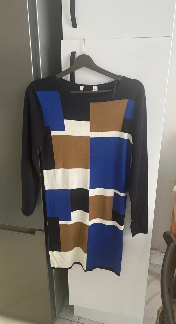 Dar kesim, uzun kollu triko elbise, crew yaka ve canlı geometrik desenlerle günlük kullanıma uygundur.