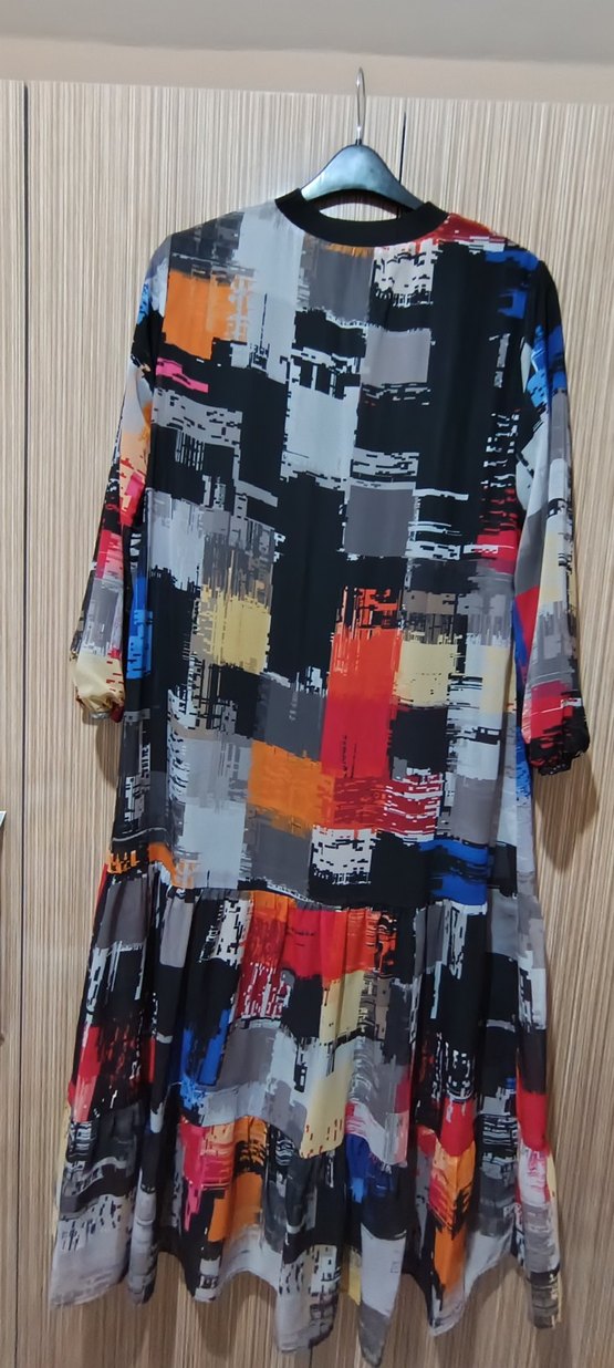 Bu uzun ve salaş elbise, koyu çok renkli soyut desenli, uzun kollu ve kayık yaka detaylıdır. Günlük kullanıma uygundur. şifon
