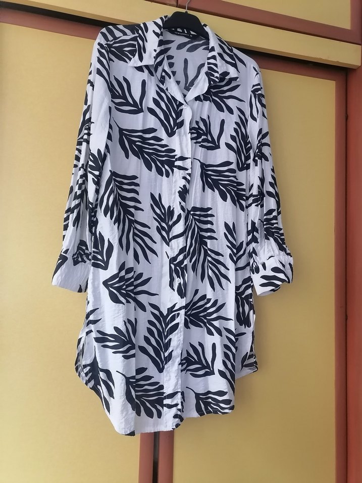 desenli, uzun kollu ve salaş kesimli kadın gömlek. V yaka ve düğmeli ön kısmı ile beyaz , ayrobin kumaştan yapılmıştır. Uzun boyda, trend günlük stil için uygundur.