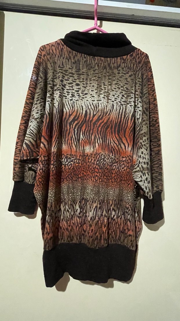 Oversize tunik, yumuşak ince polar kumaştan, desenli ve koyu kahverengi tonlarında. Uzun kollu, boğazlı ve bol kesimdir. Manşet ve etek kısmı kahverengi detayları bulunur, uzun boyu ile rahatlık sağlar.