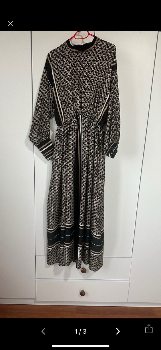 Desenli, uzun ve salaş kesim kadın elbisesi, tekne yaka ve uzun kolludur. Yumuşak sentetik kumaştan yapılmış, mütevazı ve çağdaş Paris tarzını yansıtır. Günlük kullanım için uygundur. 36-38 bedene uygun. Bir kere giyildi.