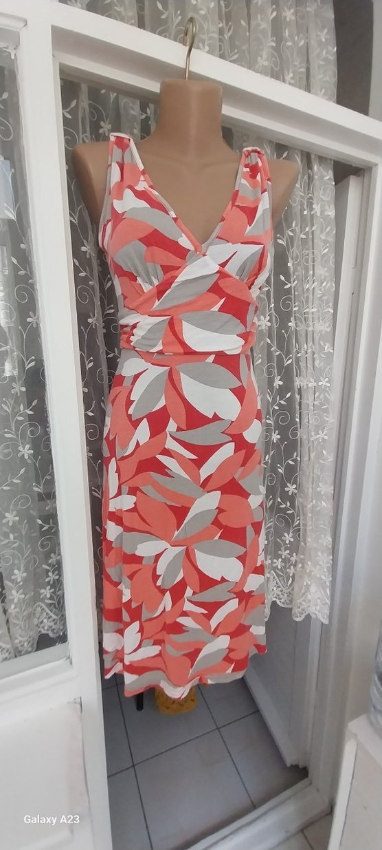 Drapeli, V yakalı, uzun boylu, renkli desenli ve ince hamile elbisesi. Gri ve mercan tonlarında, yumuşak sentetik kumaştan üretilmiştir.marka temsili