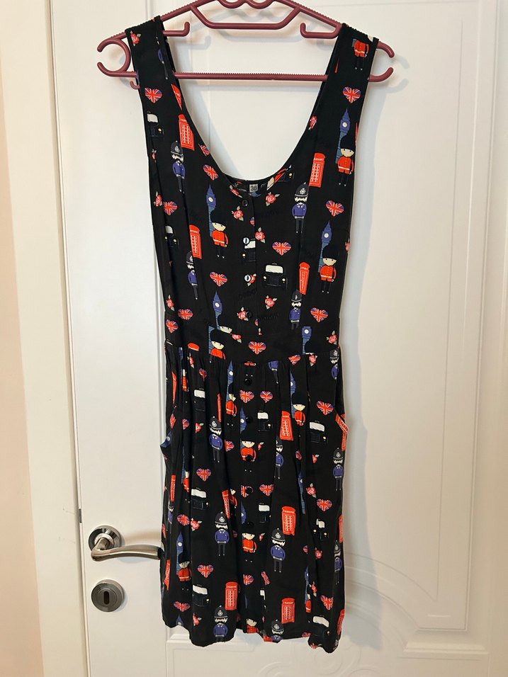V yaka, düğmeli ve kolsuz bu fitted midi elbise, günlük kullanım için desenli koyu renkli tekstil kumaştan üretilmiştir. Omuzdan boyu 88cm. İki sezon severek giyildi.