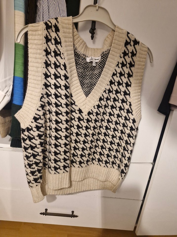 Gri renkli, desenli triko süveter, V yaka ve kolsuz tasarımıyla, rahat kesim ve normal boyda, günlük sokak modasına uygun.