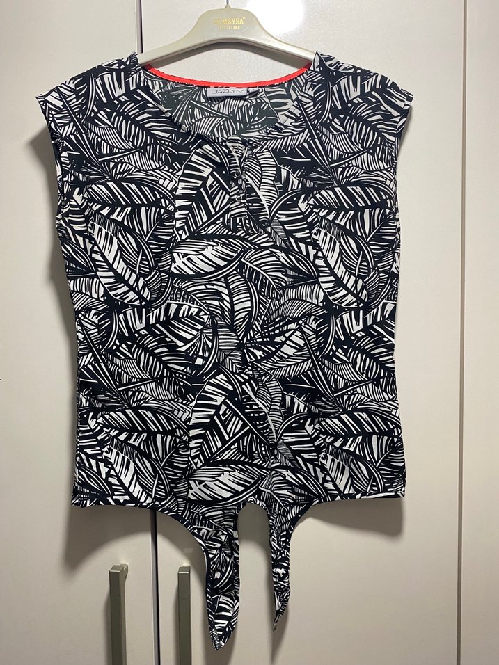 Siyah, kolsuz kadın bluz, desenli ve V yakalıdır. Sentetik kumaştan üretilmiş, vücuda oturan kesime ve pile detaylarına sahiptir. Günlük kullanıma uygundur.