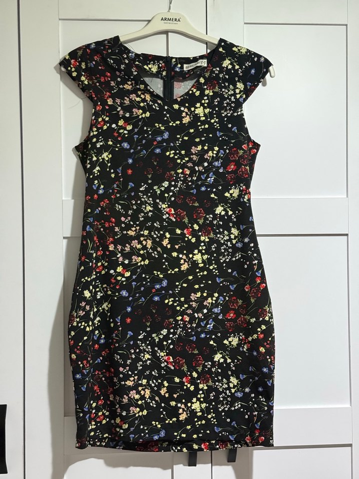 V yaka, dantel detaylı, desenli ve dar kesim midi boy kolsuz kadın elbisesi, sentetik kumaştan yapılmıştır.