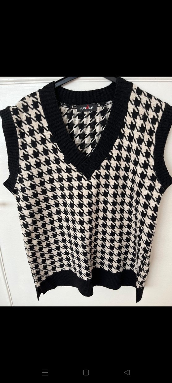 Siyah ve gri desenli, V yaka ve kolsuz, gevşek kesim örgü süveter, rahat sokak stili için uygundur.
