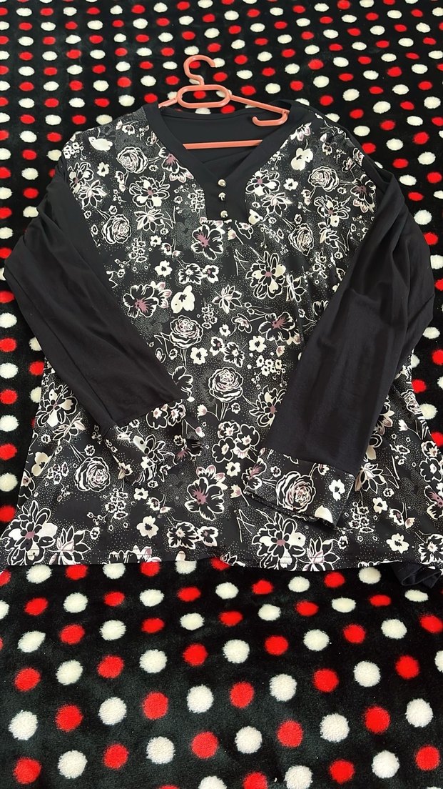Çiçek desenli, düğmeli, V yaka uzun kollu siyah bluz. Rahat kesimli, yumuşak kumaştan, günlük kullanıma uygun.