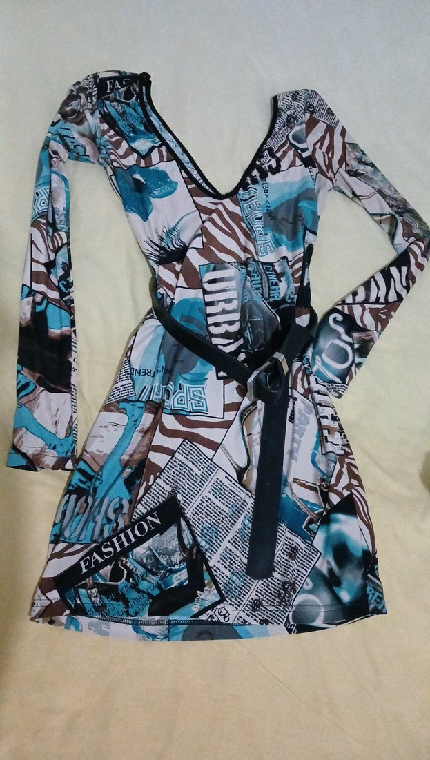V yaka ve uzun kollu, belden kemerli, mavi ve gri tonlarda baskılı, sokak tarzı uyumlu, kadın elbisesi. kemer ile birlikte 450 tl