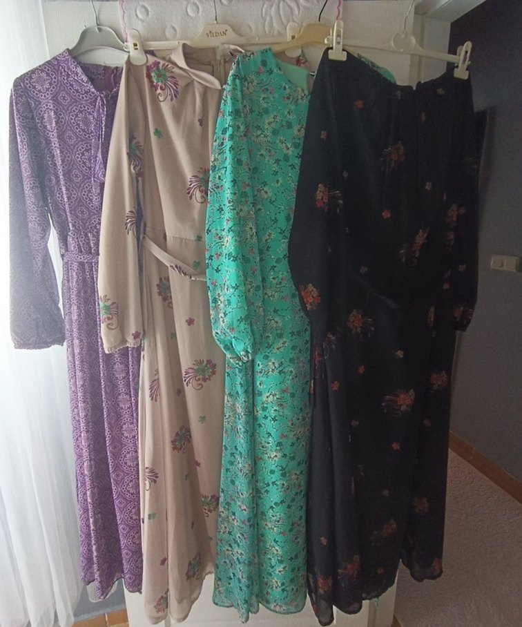 Uzun, salaş kesim bohem elbise, drapeli ve askılı kollu, V yakalıdır. Sentetik kumaştan yapılmış, koyu renkli desenli modelleri mevcuttur.