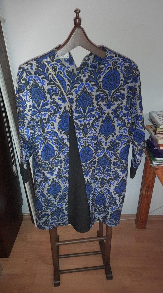 Uzun, bol kesim tunik, V yaka ve drapeli tasarımıyla koyu mavi desenli kumaştan, çağdaş Paris tarzı sunar.