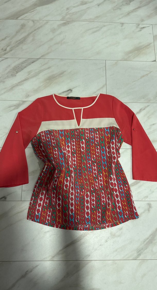 Renkli desenli, V yakalı ve düğmeli kadın bluz. Uzun kollu ve bol kesimli, günlük rahat kullanım için sentetik kumaştan üretilmiştir.